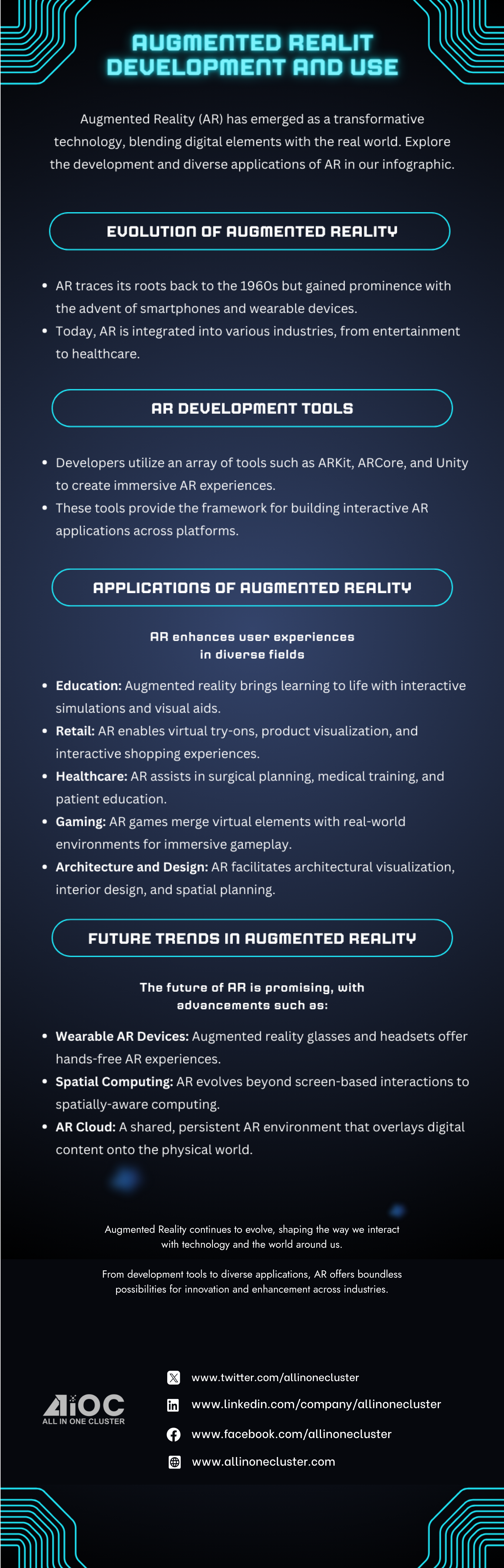 Augmented Reality (AR) has emerged as a transformative technology, blending digital elements with the real world. Explore the development and diverse applications of AR in our infographic.
