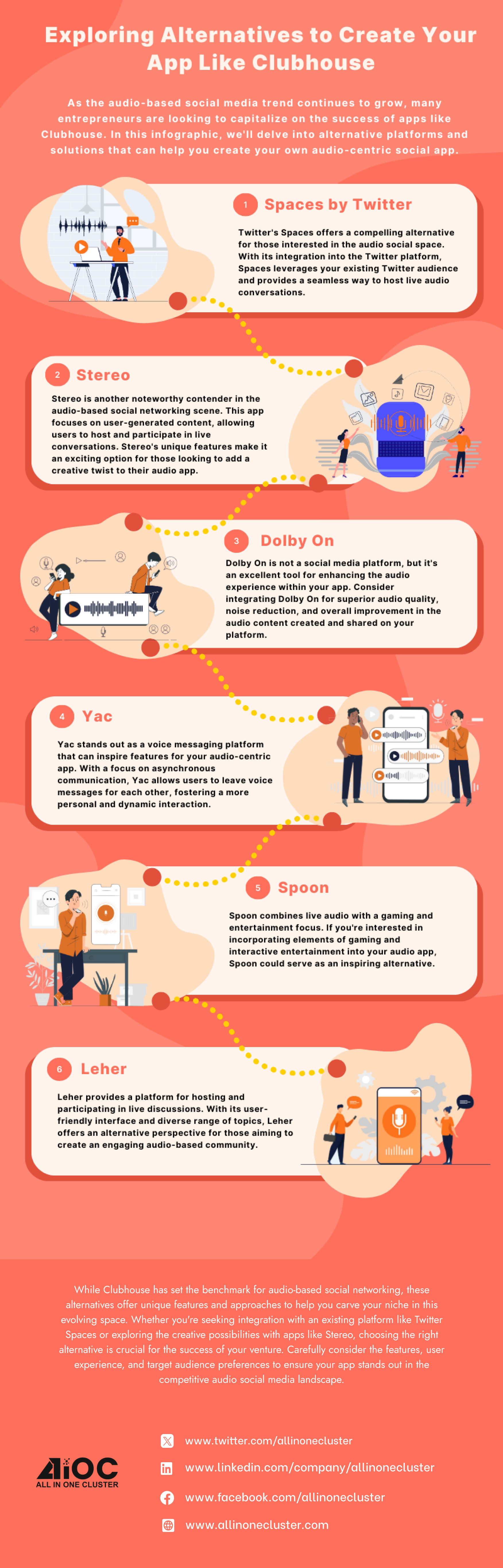 As the audio-based social media trend continues to grow, many entrepreneurs are looking to capitalize on the success of apps like Clubhouse. In this infographic, we’ll delve into alternative platforms and solutions that can help you create your own audio-centric social app.